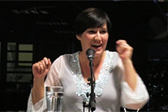 Die vielseitige Schauspielerin und Regisseurin wurde gerade mit dem Rolf-Mares-Preis als "herausragende Schauspielerin" ausgezeichnet. Zu Recht wie sie auch an diesem Abend bewies! Außerdem schreibt sie, da sie "Spaß am Spiel mit Worten hat" (Zitat). Ach ja und singen kann sie auch und zwar richtig gut, davon konnten sich die Zuhörer an diesem Abend selbst überzeugen.