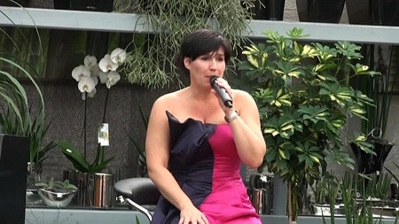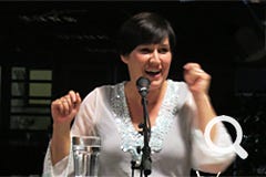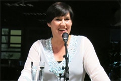 Die vielseitige Schauspielerin und Regisseurin wurde gerade mit dem Rolf-Mares-Preis als "herausragende Schauspielerin" ausgezeichnet. Zu Recht wie sie auch an diesem Abend bewies! Außerdem schreibt sie, da sie "Spaß am Spiel mit Worten hat" (Zitat). Ach ja und singen kann sie auch und zwar richtig gut, davon konnten sich die Zuhörer an diesem Abend selbst überzeugen.