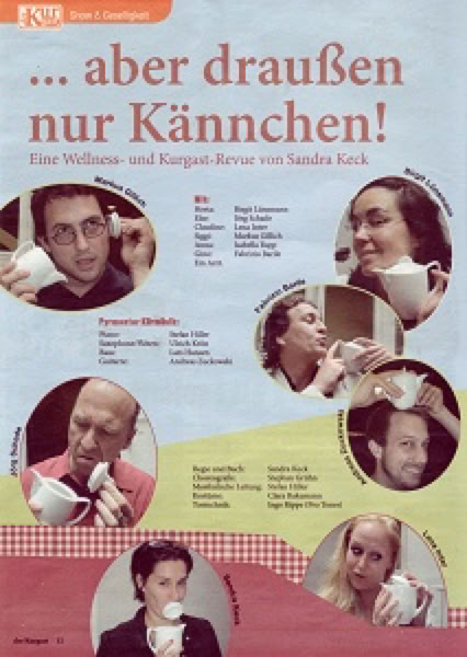 Die Pyrmonter Theater Companie ist um Ideen nie verlegen, wenn es um attraktive Programme geht. Sandra Keck, Schauspielerin und Regisseurin am bekannten Hamburger Ohnsorg-Theater, hat sich etwas Außergewöhnliches für ihre Pyrmonter Theater Companie (sie ist Gründungsmitglied) einfallen lassen. »... aber draußen nur Kännchen« heißt die Produktion, von der Experten bereits vor der offiziellen Premiere 2008 ahnten: »Das wird der Renner dieses Sommers«. Und es ist jetzt bereits der dritte Sommer! Es gibt wohl im gesamten Gesundheitswesen kaum etwas, über das mehr gefrotzelt wird, als über die Kur. Sie erinnern sich an »Morgens Fango, abends Tango«?